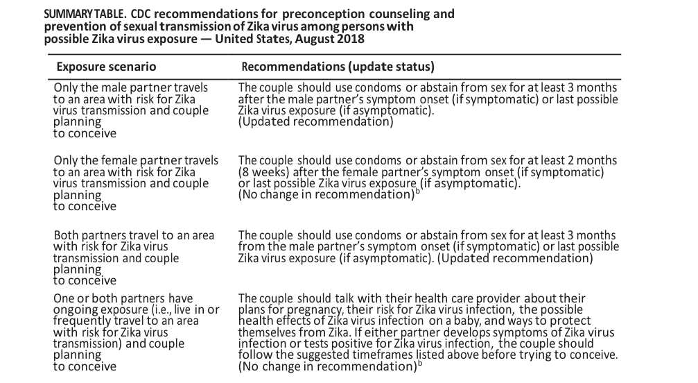 Testing for Zika virus remains a limited resource in Canada and the tests aren’t perfect. The best recommendation is to avoid travel to Zika affected countries when trying to conceive. If you cannot do that, then follow the updated recommendations which we have included below. To view the entire document, click here.
