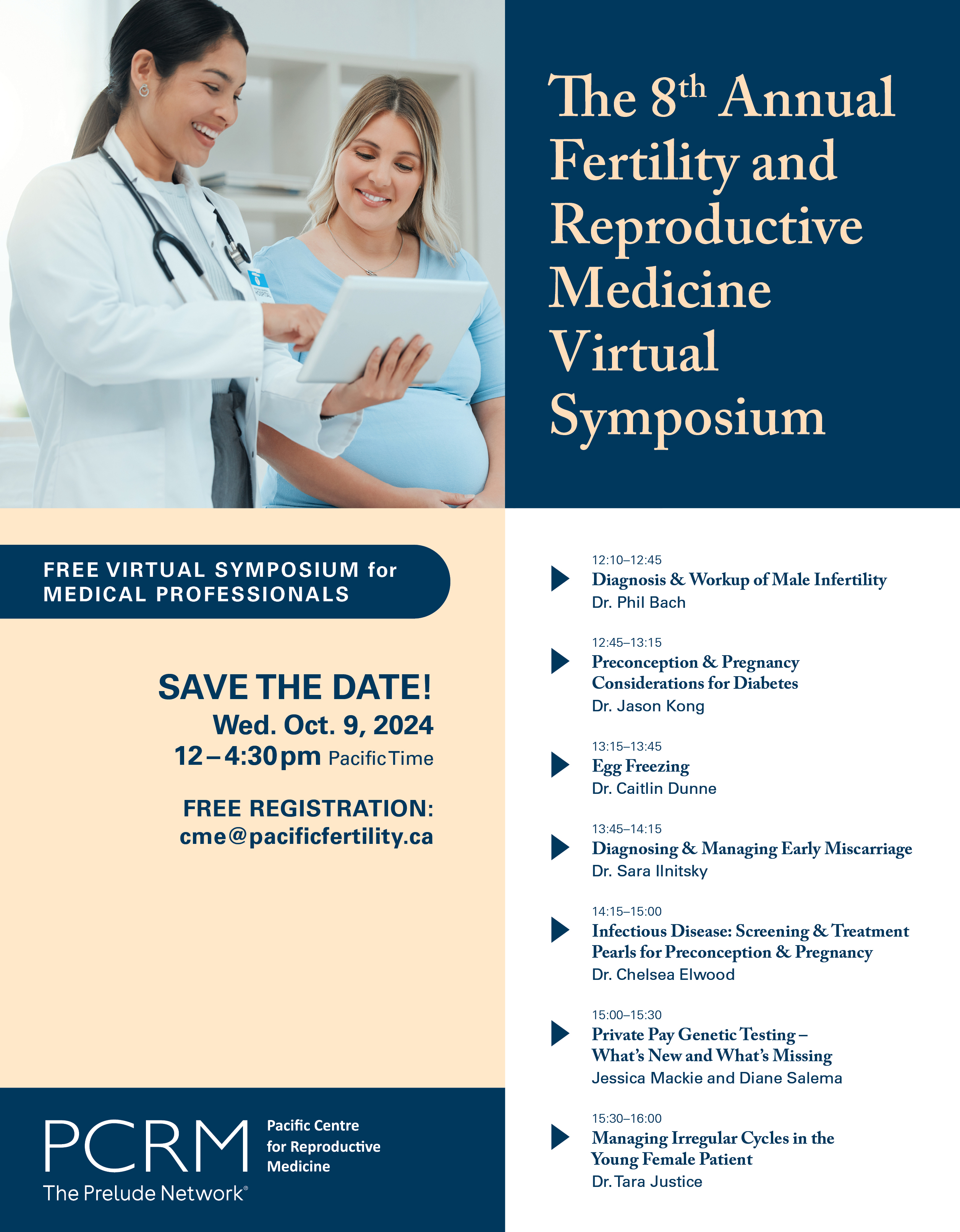 The Pacific Centre for Reproductive Medicine is excited to announce our 8th annual Fertility and Reproductive Medicine Virtual Symposium. This event will be held on Zoom on Wednesday, October 9th from 12-4:30 pm PT. Admission is free, and all medical professionals are welcome.